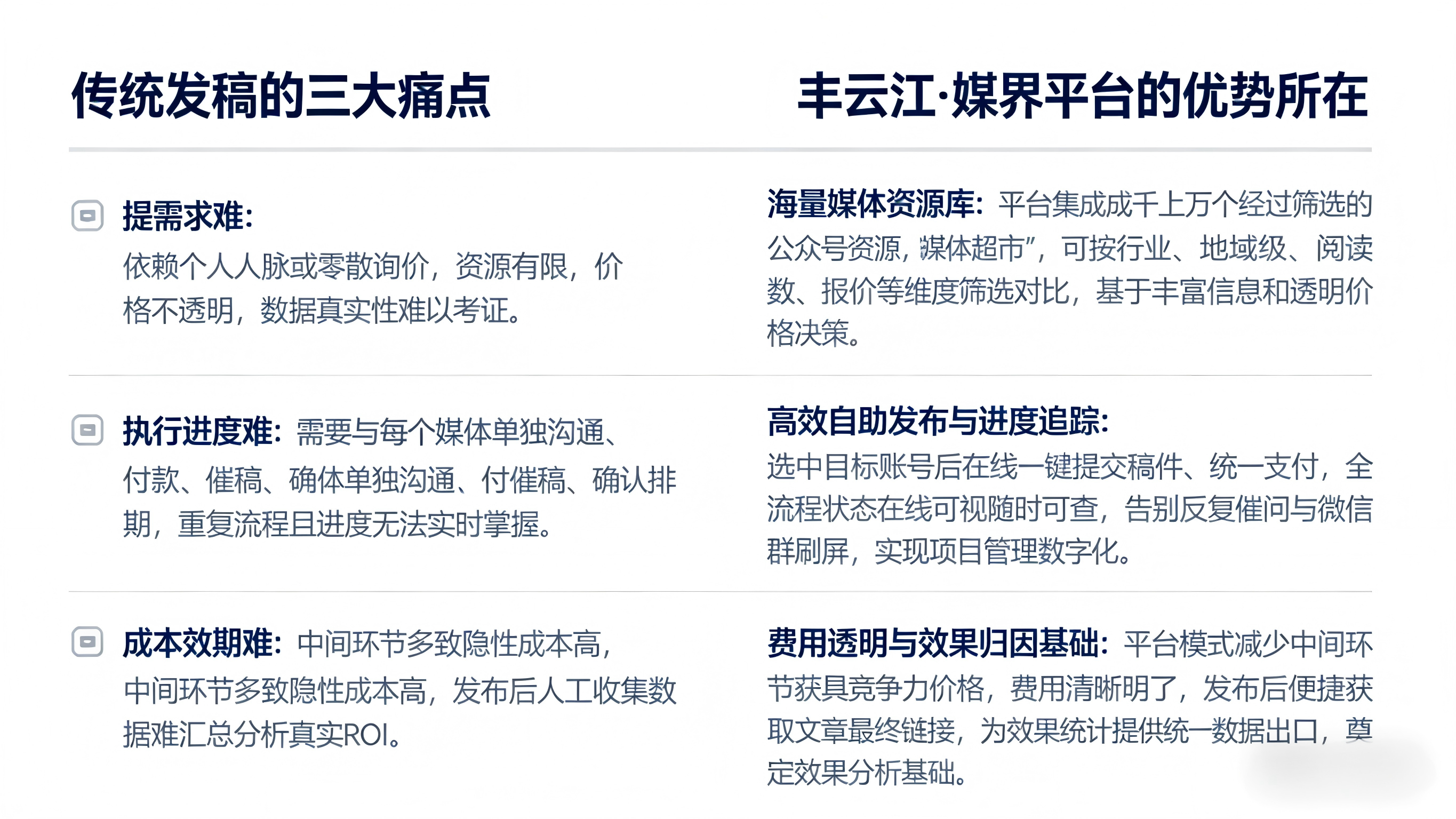 传统流程的三大痛点,正是「丰云江·媒界」这类平台的优势所在: